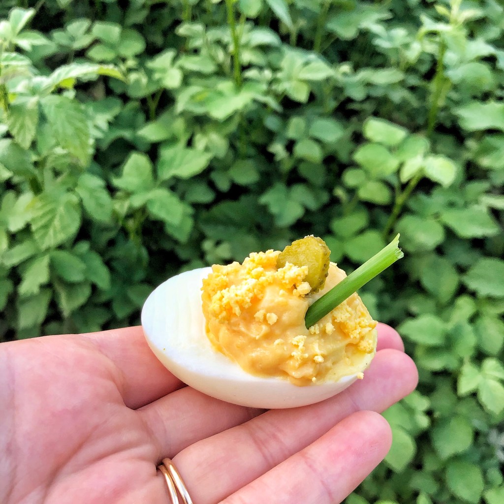 - Garnir les blancs d’oeufs de la préparation. Décorer avec une tranche de cornichon et de la ciboulette hachée.