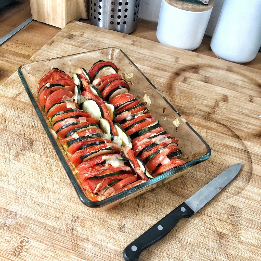 - Placer les rondelles de courgette et de tomate en les intercalant dans le plat.