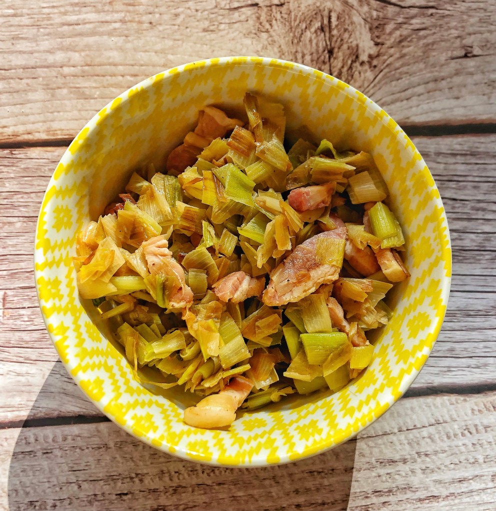 - Une fois les poireaux bien dorés (environ 15 minutes), y ajouter les lardons et mélanger.