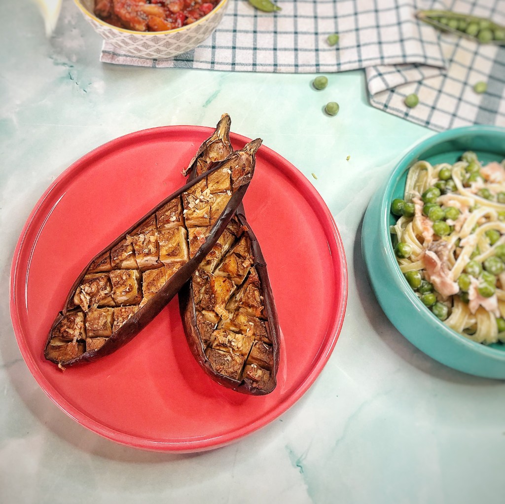 - Nettoyer et couper en deux l’aubergine, lui faire des entailles au niveau de la chair.