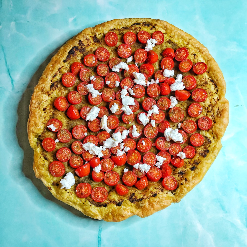 - Émietter 2 càs de fromage de chèvre frais sur la tarte une fois sortie du four.