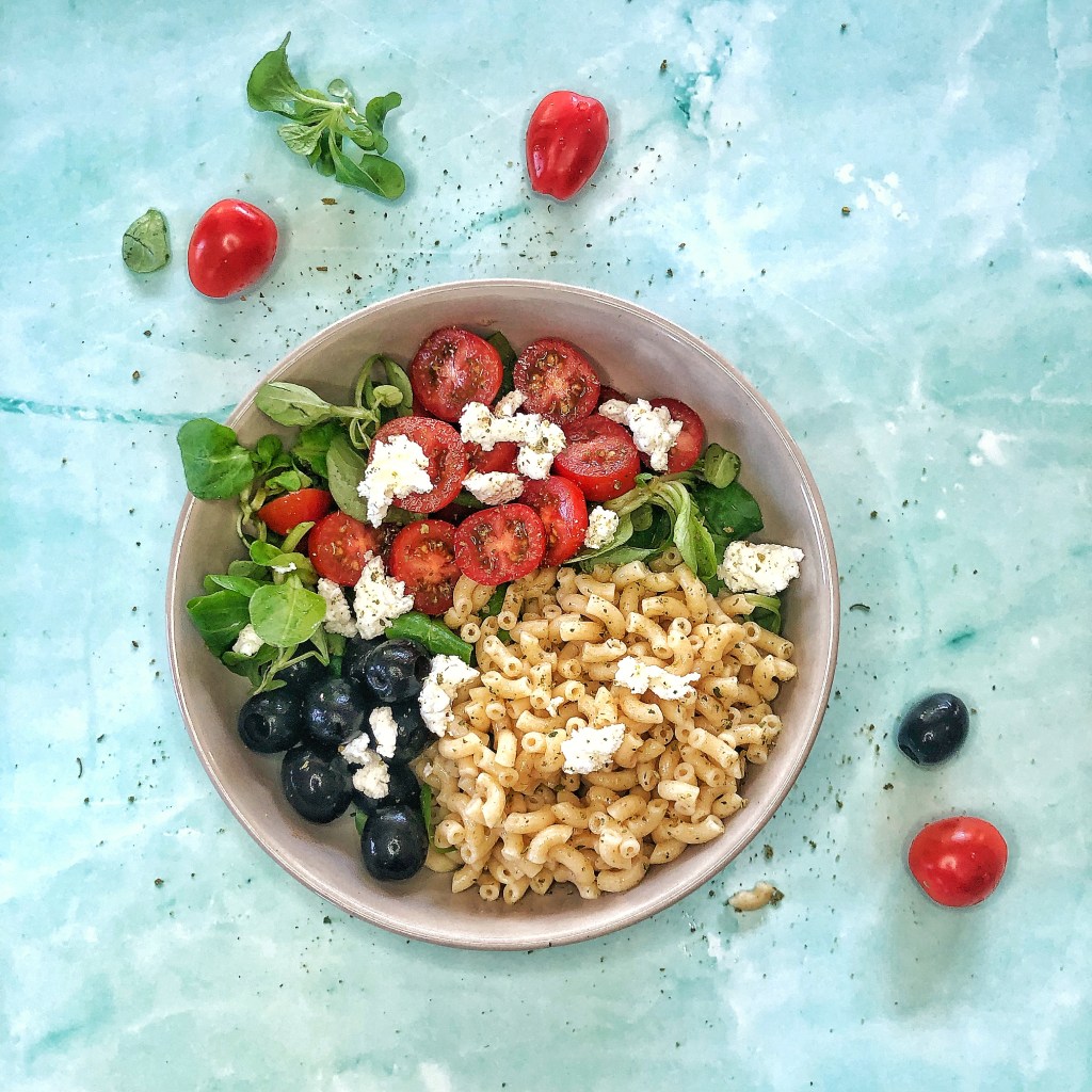- Placer les pâtes cuites dans un saladier. Y ajouter la salade, les tomates, les olives, le chèvre émietté, un filet d’huile d’olive, du sel et du poivre.